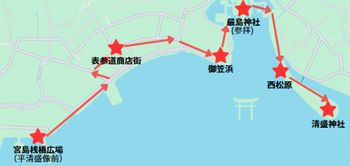 宮島桟橋前広場→表参道商店街→御笠浜。